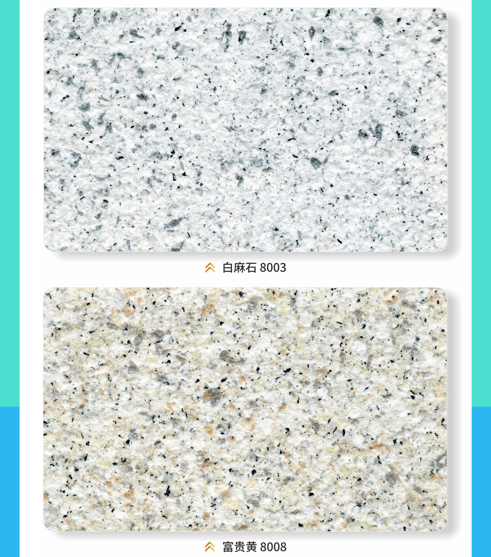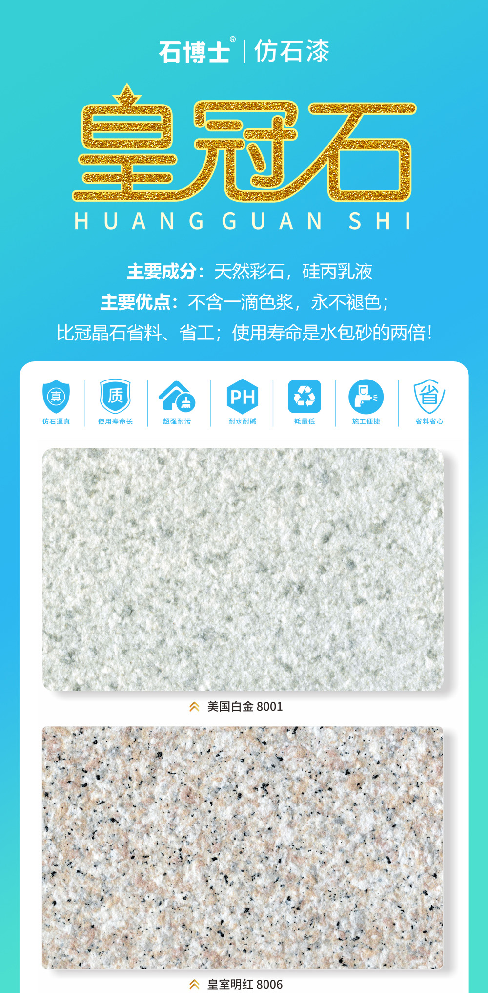 皇冠石主要成分是天然彩砂,不含一滴色浆;相对于普通冠晶石,皇冠石遮盖力更强,更少材料,用量约1.5~1.8公斤每平方!